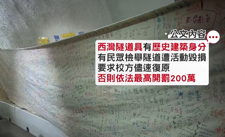 對於沒辦法保留連儂牆,學生都覺得可惜,原來西子灣隧道具有歷史建築身分,有民眾檢舉隧道遭活動毀損塗鴉,要求校方儘速復原,否則依法最高開罰200萬。
