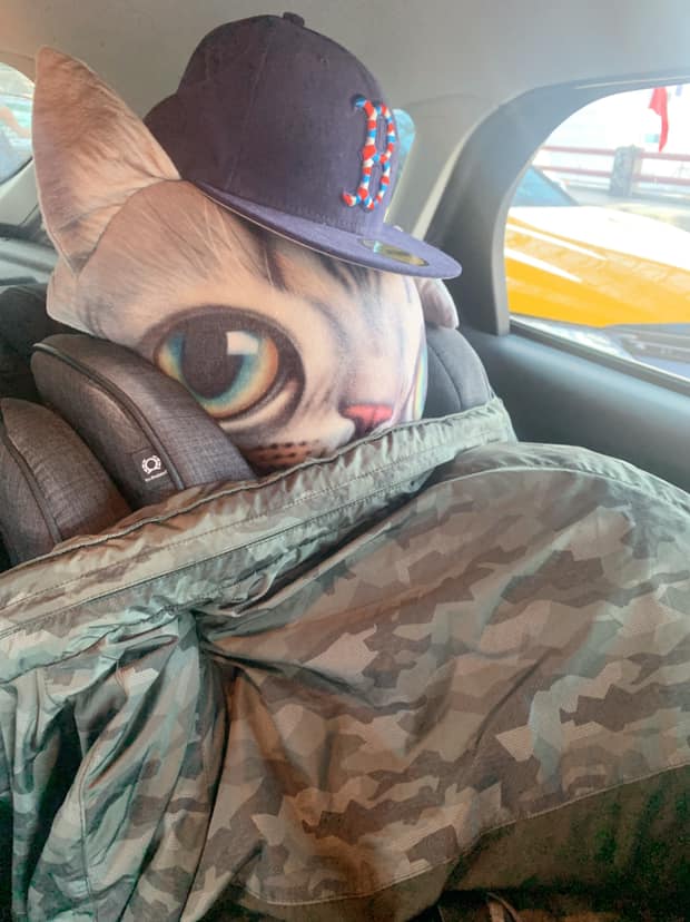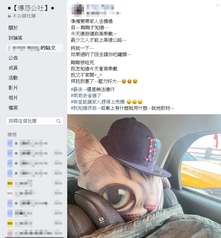 男網友在臉書社團《爆怨公社》發文,「準備要帶家人去機場,但…剛剛才知道…今天連假遇到高乘載…最少3人才能上高速公路…」,由於車上只有2個人,原PO怕家人趕不上飛機,決定鋌而走險,只見他將一顆大頭貓咪抱枕放在椅背上,並用迷彩外套、鴨舌帽喬裝成一個人坐在後座的樣子,還搞笑地說「將就一下…如果過的了回去請你吃罐頭」。