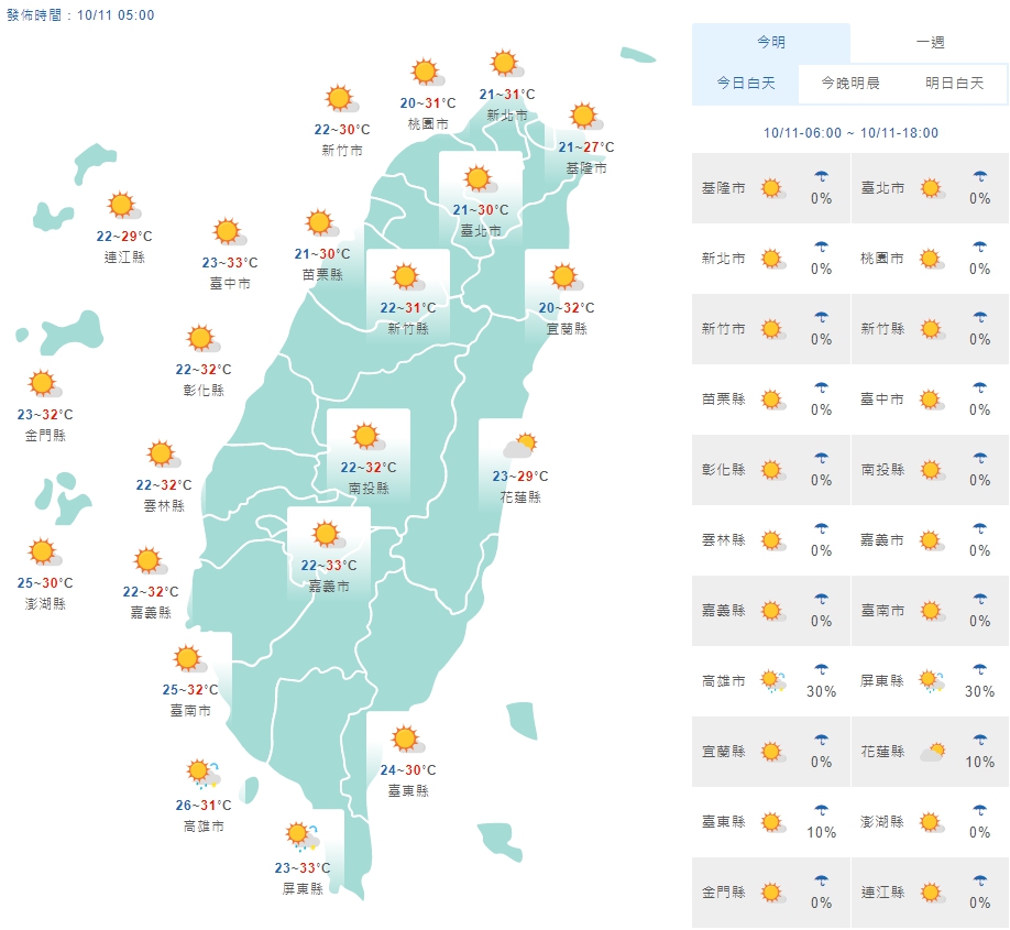 今(11)日各地大多為晴到多雲的天氣,僅花東及恆春半島偶飄雨,清晨南部沿海也有零星雨的機率,午後南部地區及中部山區有小範圍雷陣雨;氣溫方面,由於各地雲量偏少,日夜溫差較大,低溫約20至24度間,白天各地高溫則可來到28至33度,請適時調整衣物