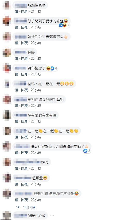 網友看完這個可愛的故事後,覺得又暖心又好笑,紛紛留言,「我看到了溫暖」、「禮尚往來就是人之間最棒的互動」、「熊貓搭起友誼的橋樑」、「果然是台灣最美的風景」;也有網友開玩笑的回應,「一段好姻緣的發生…明年準備當阿嬤」、「哇嗚,在一起在一起」、「似乎聞到了愛情的味道」。