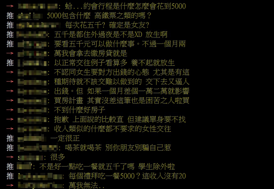 原PO聽完友人的困惱,卻沒辦法替他做什麼,因此上網詢問網友意見,「大家覺得約會花這樣是正常的嗎?還是朋友該檢討自己賺太少的關係?」文章一發布,引起網友熱烈討論,「5千是都住外過夜是不是,放生啊」、「要看5千元可以做什麼事,不過一個月2萬我會拿去繳房貸就是」、「每個禮拜吃一餐5000?這收入沒有20萬我無法」、「5千太多了啦,最好存的到錢」、「真愛不會不高興,給你參考」。