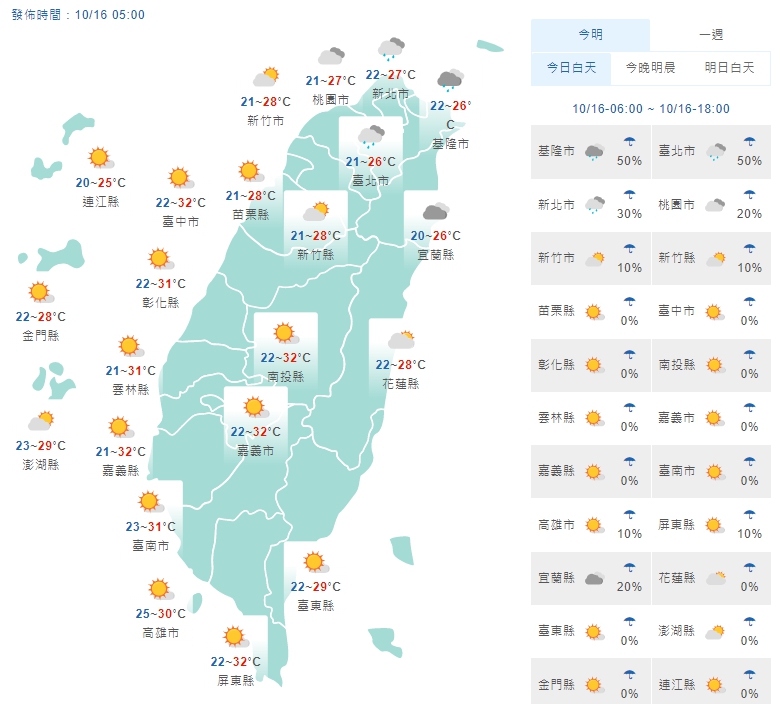 根據氣象局表示,今、(16日)受東北風影響,各地早晚天氣稍涼;台灣北部及東北部地區有局部短暫雨,東部及東南部地區有零星短暫雨,其他地區及澎湖、金門、馬祖為多雲到晴,午後南部地區有局部短暫陣雨;氣溫方面,今(16日)晨各地低溫約20至25度,白天高溫在北部及東半部約26至29度,中南部可達32度,中南部地區日夜溫差較大請適時調整衣物。