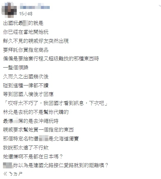 「出國玩最X的就是,你已經在當地開始玩,鮮久不見的親戚好友突然出現,要拜託你買指定商品」,原PO在《爆怨公社》發文,表示出國就是要放鬆,幫人代購會讓他非常煩躁,尤其是要捨棄行程又超級難找的商品,為了避免這種狀況發生,原PO出國幾次後,碰到這種訊息一律都不讀,等到回國後才回應「哎呀!太不巧了,我回國才看到訊息,下次吧!」