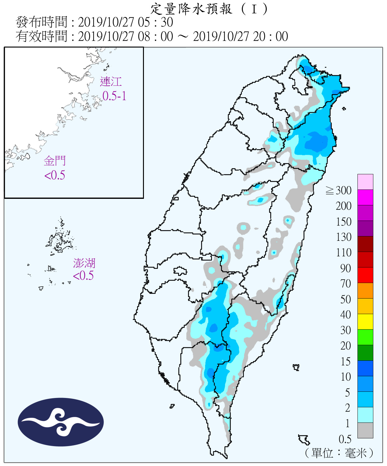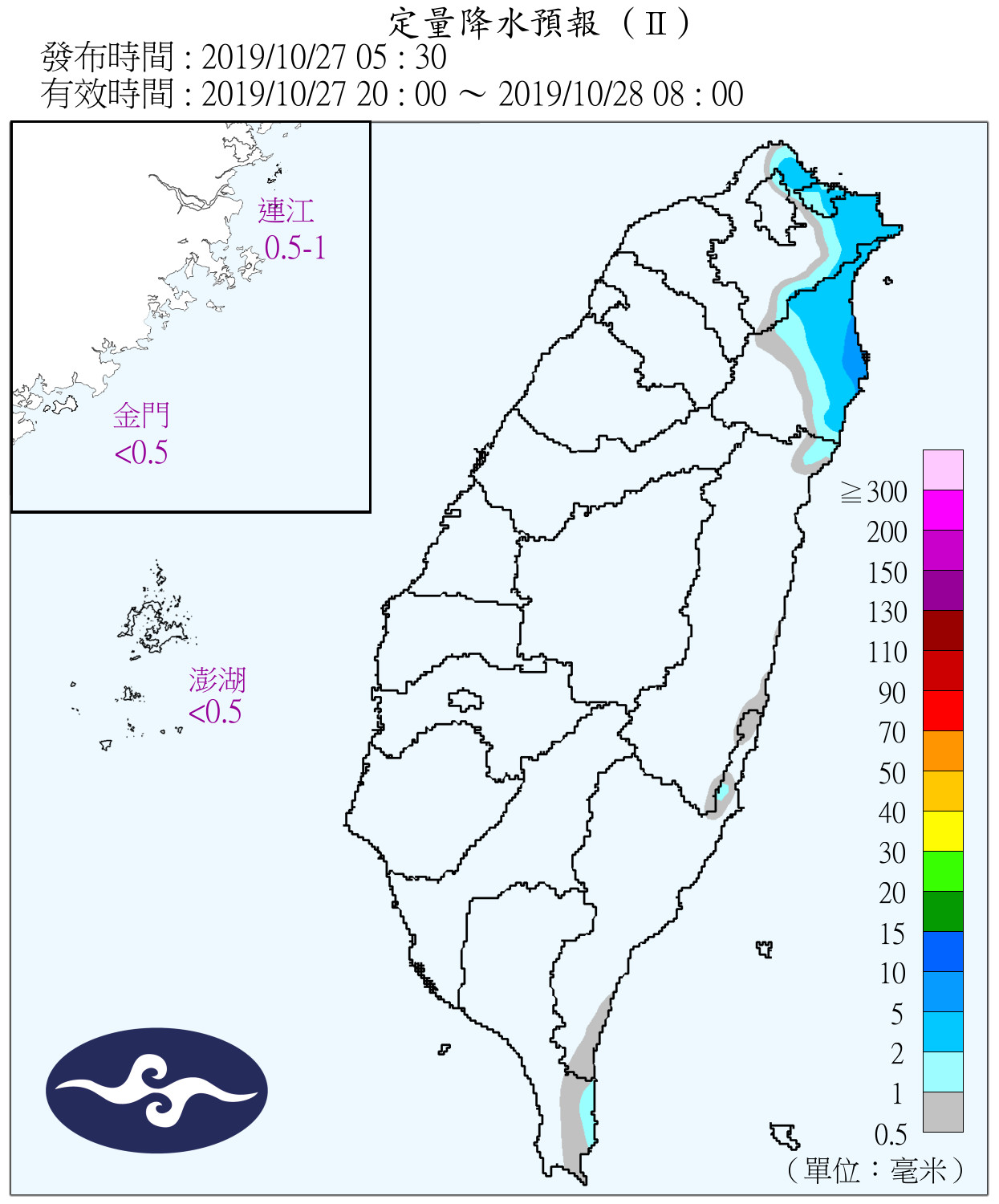 另外,據《ETtoday新聞雲》報導,氣象局預報員陳伊秀指出,今(27日)天氣和26日差不多,基隆北海岸、宜蘭和大台北山區降雨機率稍微高一點,但雨比較零星,其他地區為多雲到晴。未來一周天氣則會受到東北風影響,降雨偏向東半部、基隆北海岸和大台北山區,有時雨多、有時雨少;目前模式反應周六(11月2日)、周日(11月3日)降雨會比較多,但仍有不確定性,還要再觀察。