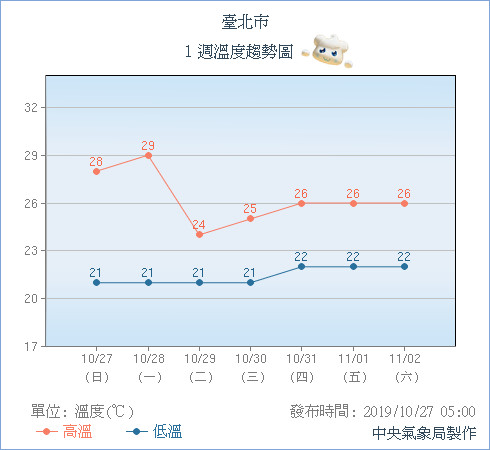 根據氣象局預報顯示,下周一東北風稍減,且水氣不多,各地大多是多雲到晴的天氣,不過下周二開始東北風增強,將會持續影響到下周六(11月2日),北部、東半部高溫會下降5度,各地早晚較涼,伴隨的水氣也多,北部及東半部也會有斷斷續續降雨出現,中南部地區則是較穩地的天氣型態,僅山區午後會有零星陣雨。
