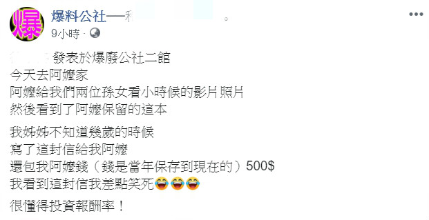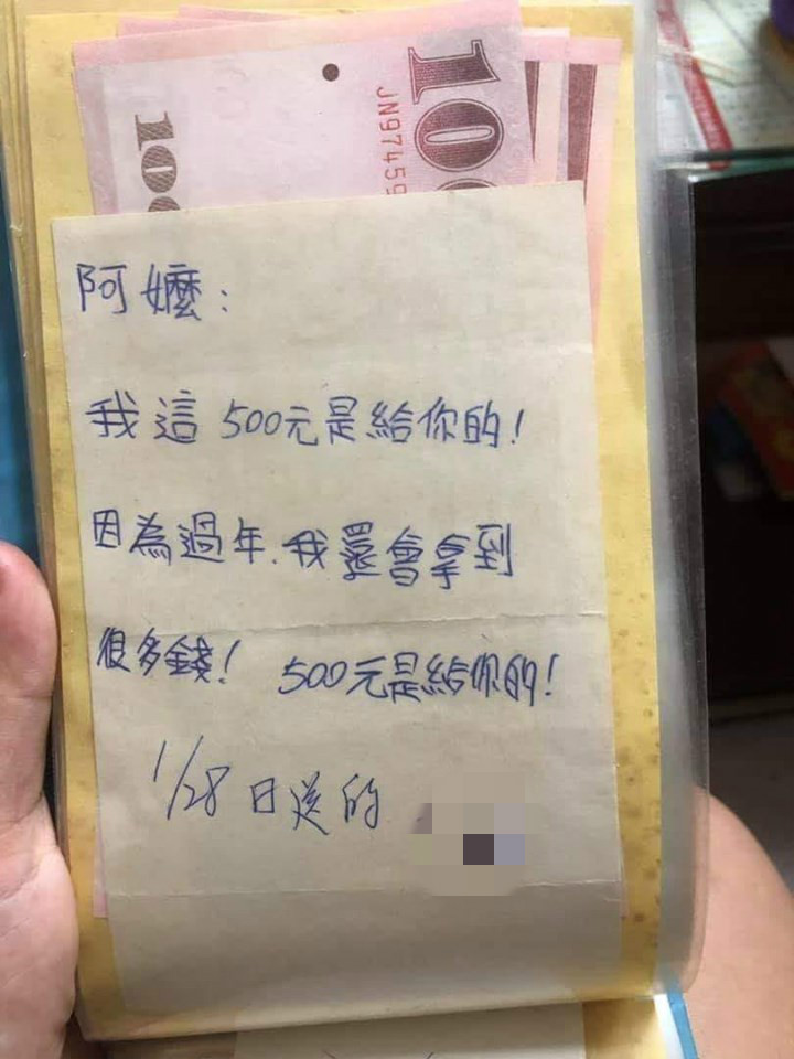 該名徐姓女網友昨(28)日在臉書「爆廢公社二館」分享一張照片,發文表示,去阿嬤家的時候,阿嬤給她和姐姐看小時後的影片和照片,突然發現阿嬤保留了一本神秘的資料夾,翻到其中一頁,見到裡面放著幾張百元鈔票及一個小紙條,用著有些歪斜的字體寫著,「阿嬤:我這500元是給你的!因為過年我還會拿到很多錢!」,而最後還註明這是1月28日送的。