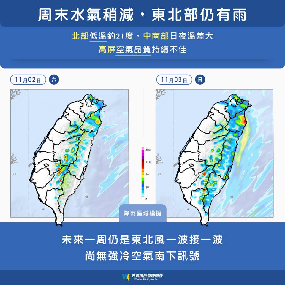 溫度方面,清晨低溫多在21、22度上下,其中週三清晨更為偏涼,中部以北低溫約19、20度,白天高溫北部及宜花由於雲量較多,約在26至27度間,其他地區則有28至31度,北部及宜花整天舒適至稍涼,臉書粉專「天氣風險 WeatherRisk」也表示,下周將會是東北風一波波的天氣型態。