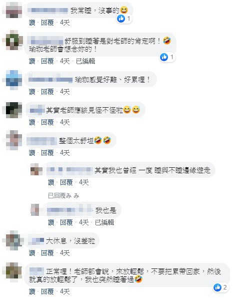 本來以為自己超糗的原PO,貼文一出,立刻引來許多網友心有戚戚焉的笑回,「我常睡,沒事的」、「我也有過旁邊的同學要叫我。老師說沒關係讓她睡!老師說這樣子是真的有身心靈放鬆!」、「躺平的動作最難(因為會睡著)」、「每次老師這樣說時,過一分鐘都會聽到有人打呼!」、「睡過!沒什麼好羞恥的,老師很成功,讓人放鬆到底」。