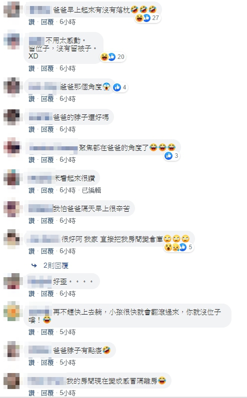 照片曝光後,網友目光全聚焦在原PO老公的詭異姿勢,紛紛歪樓,「爸爸早上起來有沒有落枕」、「不用太感動,留位子,沒有留被子」、「爸爸的脖子還好嗎」、「我怕爸爸隔天早上很辛苦」、「爸爸要落枕了」、「妳老公的頭已經不符合人體工學了」、「爸爸是貓頭鷹的概念嗎」、「這醒來要去國術館了吧」,也有女網友羨慕表示,「很好啊!我家直接把我房間變倉庫」、「我還沒嫁人就沒房間了!回家已經像客人」、「羨慕~我已經沒房間了…變成老哥結婚的新娘房」。
