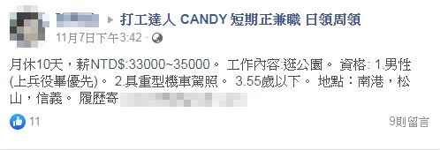 原PO在PTT貼出照片表示,自己在臉書徵才板上,看到一份工作,只見上面寫著月薪33K至35K ,工作內容是「逛公園」,不過應徵人員必須具備3樣資格,分別是要男性(上兵役畢優先)、具重型機車駕照、55歲以下;而工作地點則是在台北市南港、松山、信義3個地區,但這樣的條件,也讓原PO心生疑問,「逛公園需要機車駕照?具體工作內容是啥啊?」