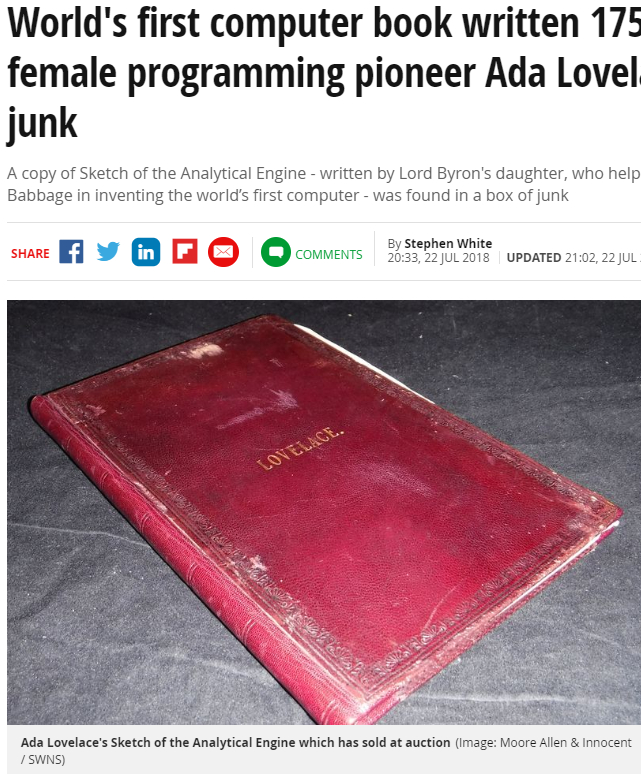 綜合外媒報導,該本書「分析機草圖」(ketch of the Analytical Engine)是由英國數學家,同時也是英國詩人拜倫的女兒愛達•勒芙蕾絲(Lady Ada Lovelace)所著作,該書在1843年出版,加上副本6本,世界上一共只有7本。而英國夫婦發現的這本封面還有勒芙蕾絲親筆簽名,裏頭更記有為電腦先驅巴貝其(Charles Babbage)演講所做的翻譯,及她對自身理論的解釋。