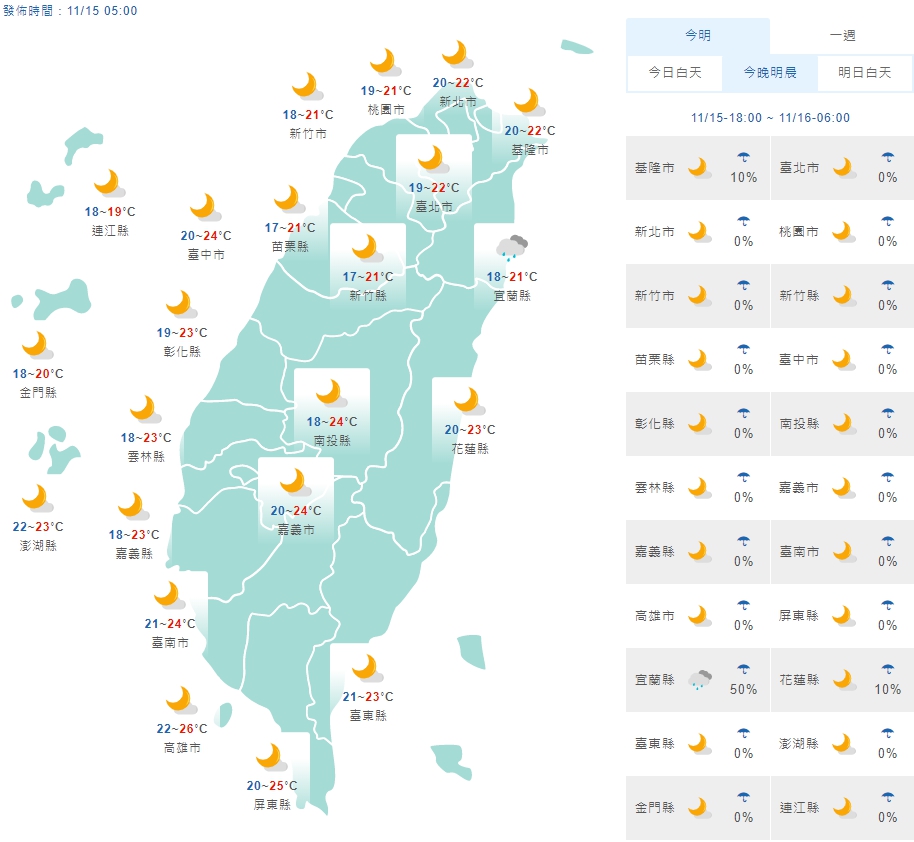 今(15日)東北季風持續影響,但較乾的空氣移入,各地大多為多雲到晴的天氣,僅東半部有零星短暫雨;氣溫方面,清晨各地低溫約17至20度,白天因水氣減少,北臺灣高溫將較昨(14)日回升,約25至27度,花東高溫與今日類似約26、27度,中南部高溫可達28至30度間,中南部日夜溫差較大。
