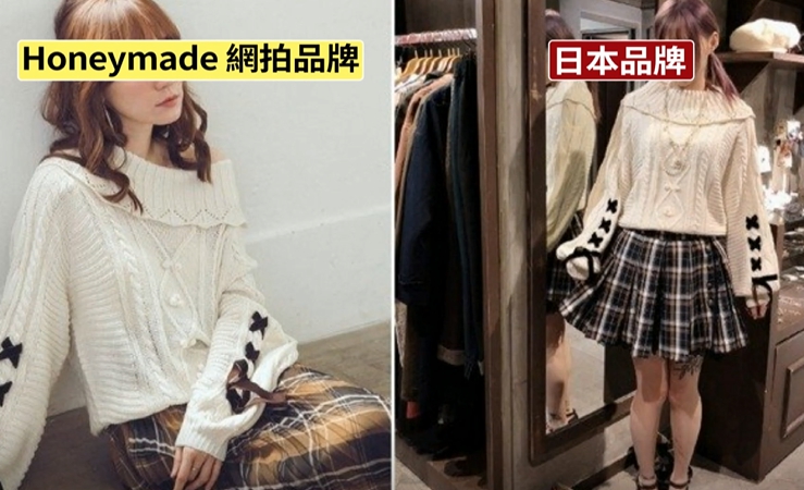 還有這件白色的毛衣,寬大的領口造型,袖子上一邊還點綴,四個小蝴蝶結,左邊是網拍品牌Honeymade,右邊則是知名日本品牌,因為設計實在太像,被民眾爆料抄襲會不會抄的太誇張。