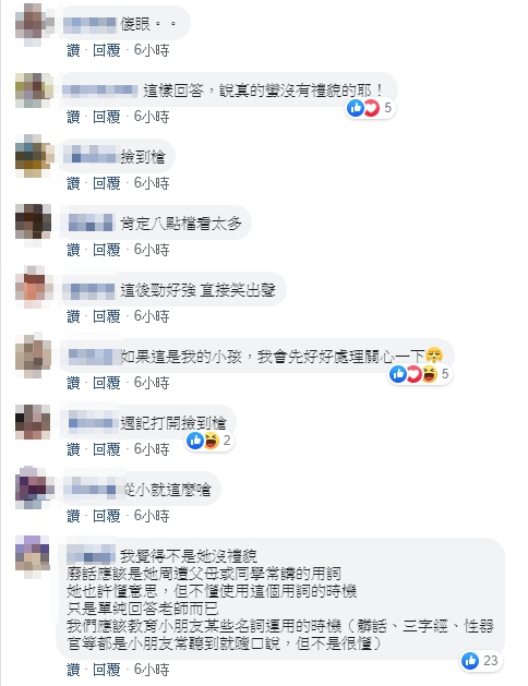 不過也有網友認為,小小年紀這樣回話實在不妥當,家長還須多教育,「我覺得蠻沒禮貌的」、「雖然老師說廢話,但這樣回很沒家教」、「這孩子的未來挺堪憂的」。