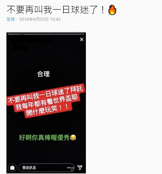而其實除了棒球外,其它賽事也很常出現「一日球迷」,日前也有網友在Dcard分享,表示曾人被說一日球迷不開心,怒在限時動態貼文「不要再叫我一日球迷了拜託!我每年都有看世界盃(足球)耶,開什麼玩笑!!」。
