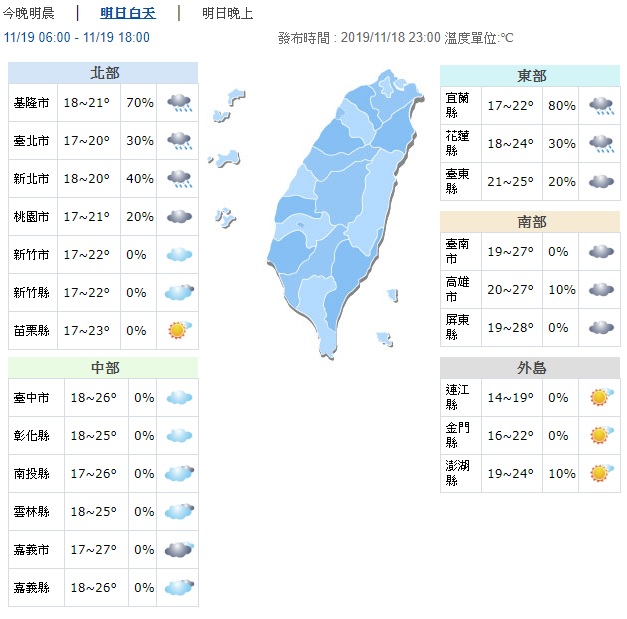 中央氣象局表示,明天(19日)受東北季風影響,北部及東半部地區有局部短暫雨,其中東北部地區降雨較持續,南部地區雲多偶飄雨,中部地區則為多雲的天氣。而泣溫方面,今天愈晚愈有涼意,明天是這波東北季風影響期間最冷的時候,清晨、深夜中部以北及東北部地區低溫約16至18度間,入夜要記得多加件衣服。