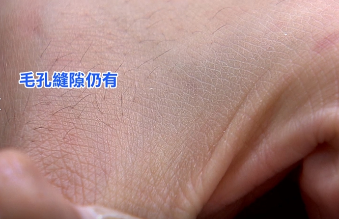 但是鏡頭靠近點放大來看,毛孔縫隙間還殘留著白色物體。