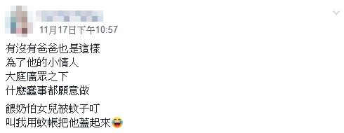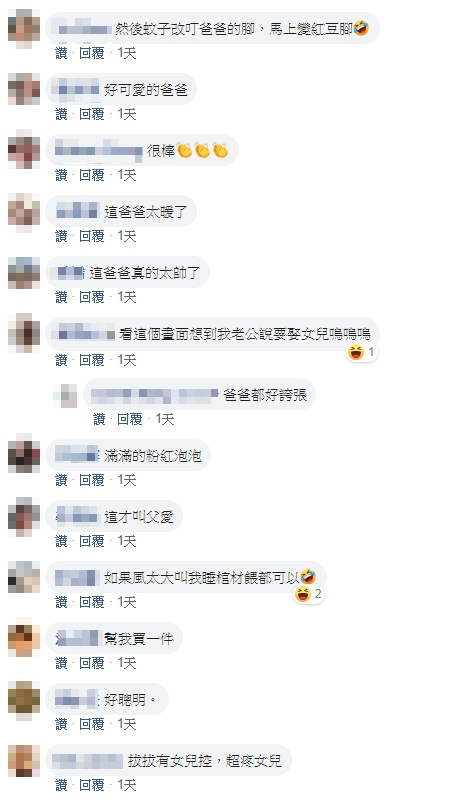 這個十分有愛的餵奶畫面一曝光,隨即吸引逾1.2萬人按讚,網友紛紛笑說:「上輩子的情人,一定要小心呵護啊」、「我怎麼覺得有粉紅泡泡圍繞著他們倆」、「好爸爸,Q嫩嫩的嬰兒真的很容易被蚊子攻擊」、「一切看起來他們才是真愛」、「太有愛了,不過爸爸,紗網都貼在北鼻的皮膚上了,蚊子還是咬得到啊」、「只寧願犧牲爸爸的小腿,也不能讓前世情人被叮到」。