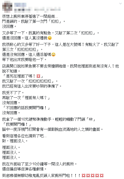 女網友在臉書社團《爆怨公社》分享經驗,表示因為內急到超商借廁所,由於門是鎖的,她敲了第一次門「扣扣」沒回應,「又多等了一下,我真的有點急」,於是她敲了第二次,但還是沒人應門,原PO當下心想,「這人真沒禮貌,我很耐心的又多等了好一下子,這人是在大號嗎?有點火了」,她敲了第三次,還是沒動靜,她頓時怒火上升,「這人還活著嗎?等下他出來我要瞪他一下」。