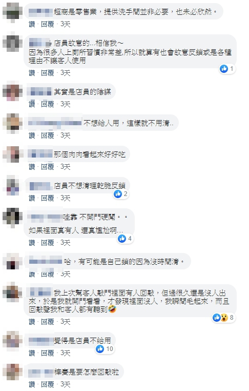 超糗經驗曝光,網友紛紛留言,「我以為人家在擦屁股,妳還一直敲門」、「我遇到的是敲門沒人回應,看門也沒鎖結果門一開,一個男的蹲在裡面大便」、「我有因為燈沒關,以為裡面有人等了十分鐘...結果根本沒鎖也沒人」,多數人則認為,「結果是店員鎖的,因為他不想掃廁所」、「應該是店長交代,很多人都把廁所搞得像戰場,所以現在很多都不外借」,但也有店員說,「我上次幫客人敲門,裡面有人回敲,但過很久還是沒人出來。於是我就開門看看,才發現裡面沒人,我瞬間毛起來,而且回敲聲,我和客人都有聽到」。