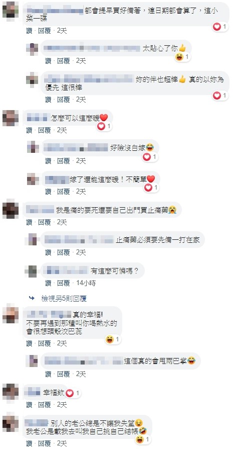 貼文曝光後,這暖心佳話也讓網友紛紛羨慕,「別人的另一半不會讓人失望」、「真好,我老公不會這樣」、「好好哦,我痛死都沒有人買」;也有人分享自身經驗,表示「我都會提早買好備著,連日期都會算了,這小菜一碟」、「我都先買好放車上,等她需要直接拿了」,不過也有苦主笑回,「我會幫女朋友買啊,重點是沒有女朋友啊」。