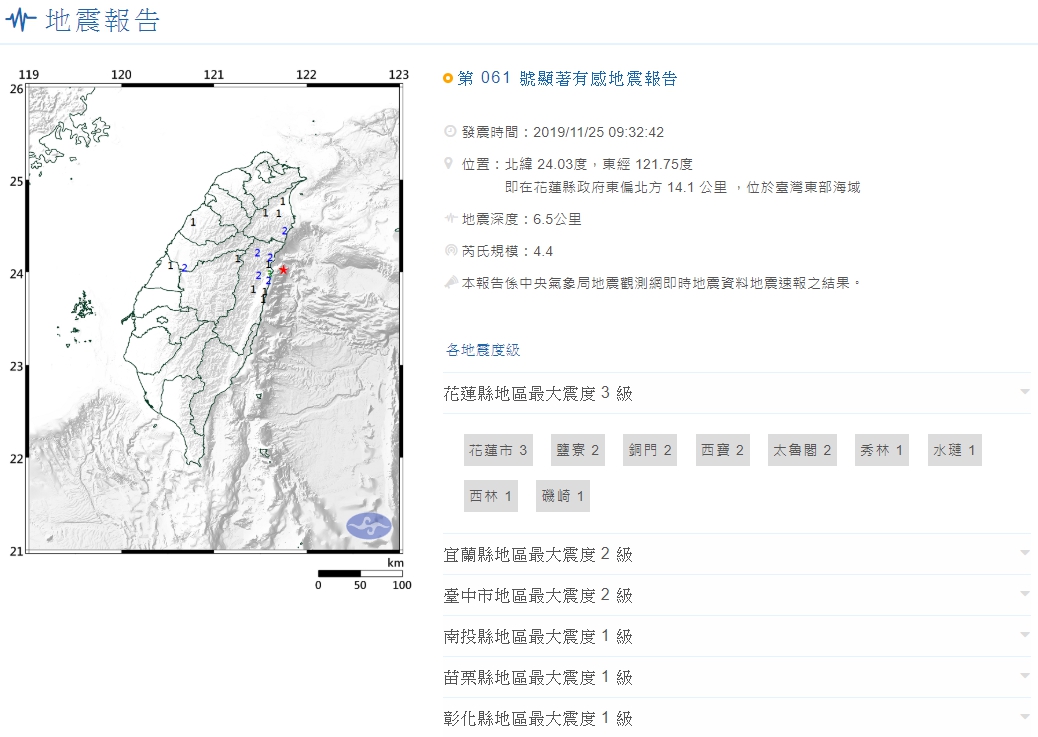今(25)日上午9點32分,花蓮近海發生芮氏規模4.4地震,地震深度6.5公里,震央在花蓮縣政府東偏北方14.1公里,位於臺灣東部海域,花蓮市最大震度3級,宜蘭、台中也有地區震度達2級。