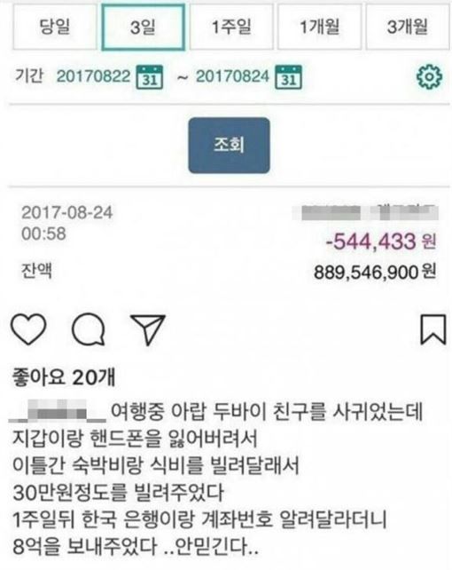一名網友在韓國論壇inven發文,透露在旅行時遇到一名來自杜拜的男子,對方表示自己的錢包和手機都不見了,想向他借錢,當下他沒多想,二話不說就借給對方30萬韓元(約8000元新台幣),杜拜男子並跟他要了聯絡方式,表示一定會還錢。沒想到,過了一個禮拜後,對方和他連繫,還跟他要了銀行帳戶,不久後竟在戶頭發現8億韓元(約2200萬元新台幣),跟他借出去的30萬韓元,整整多了2750倍。