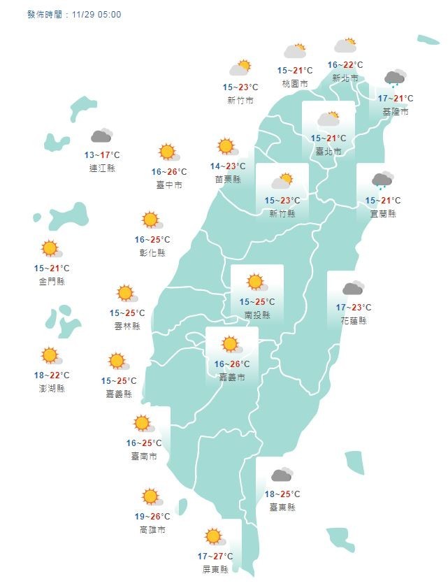 今(29)日受東北季風影響,此波冷空氣影響最明顯的時候出現在清晨,全台平地自動測站最低溫出現在桃園楊梅14.1度,中部以北及東北部低溫僅15、16度,沿海空曠地區會再低一些,東北部及大臺北地區仍有局部短暫雨,花東及恆春半島降雨較零星,其他地方則為多雲到晴。
