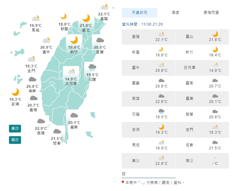 ▼中央氣象局表示,明日(12/1)北部、東北部高溫大約在26度左右,中南部則可達28度。(圖/翻攝自中央氣象局)