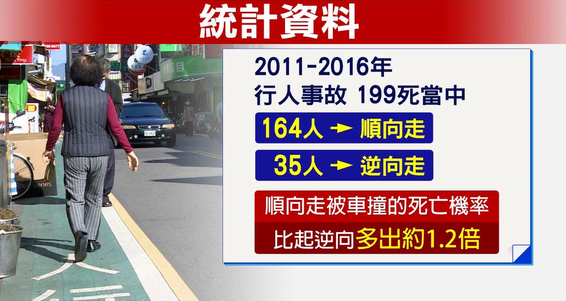 但根據國內學者,統計資料分析,2011到2016年行人事故199死當中,有164人是順向走,35人逆向走,也就是說進一步比較死亡風險,發現順向走被車撞的死亡機率比起逆向走多出約1.2倍。