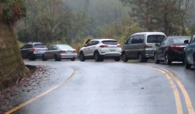武嶺停車場大爆滿,出入口車陣大排長龍,混亂中還有人逆向插隊,被員警制止。