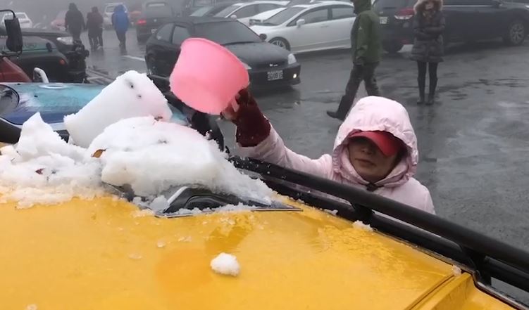 但天氣轉乾冷,合歡山只有清晨下起冰霰,有遊客就地取材,用前一天下的積雪做成小雪人。
