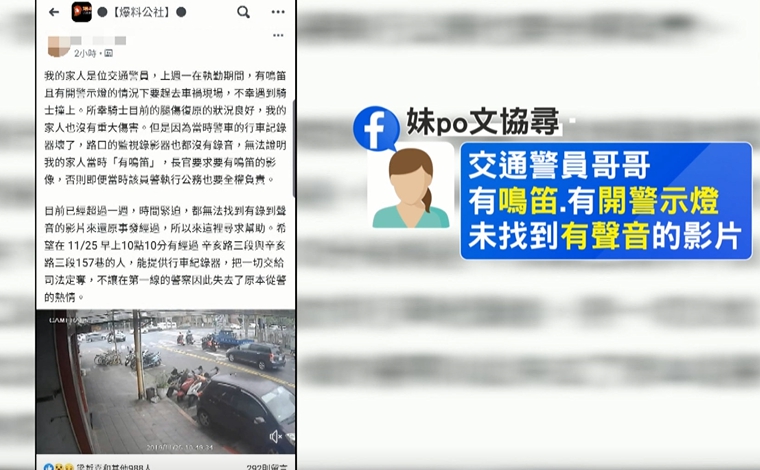 一輛警車趕著處理公務,在「禁止左轉」的路口左轉,遭到綠燈直行的機車撞上。事後員警妹妹在網路上請大家協尋「鳴笛」影像,否則哥哥會受罰,不過機車騎士則出面控訴,當時警車根本就沒有鳴笛閃燈,雙方各說各話。