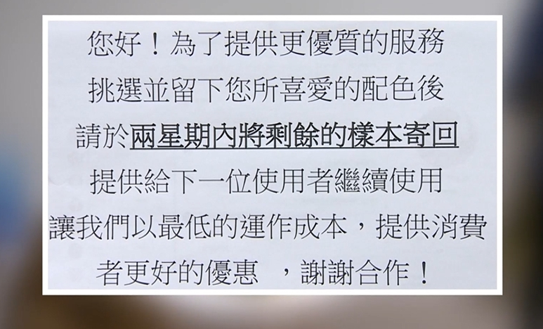 業者附上這A4單子在裡頭,內容大概就是看完地板樣品兩周內寄回,多數客人都有按照規定,但一名客人因為不想付運費,和業者槓上。