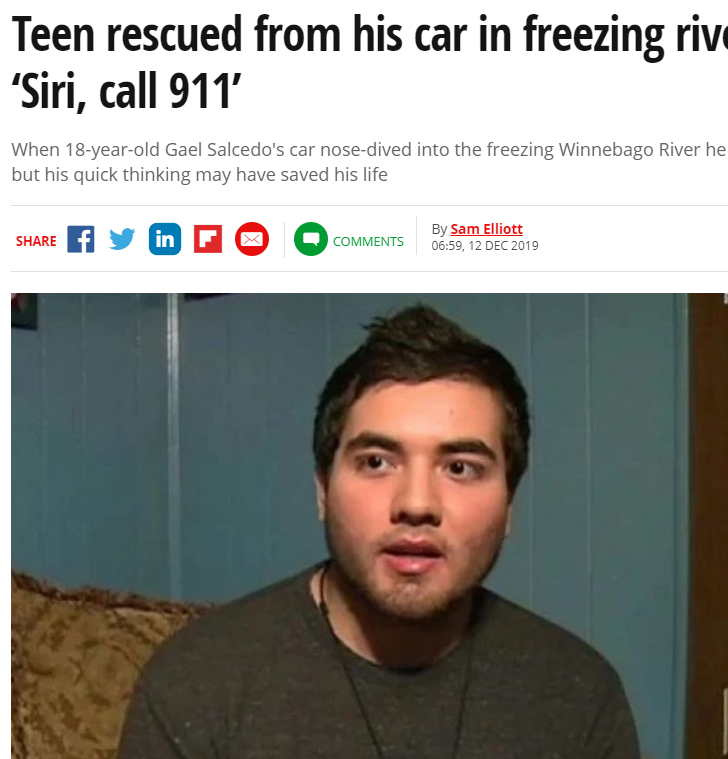 不少iPhone使用者喜歡直接喊一聲「Hey Siri」,不需要用手觸控屏幕,便能輕鬆搞定大小事,但你有想過在危險時刻,它還能救命嗎?美國愛荷華州一名男大生薩爾賽多(Gael Salcedo)開車上學時,因路面積雪結冰,不小心失控打滑,導致整台車墜入河中,所幸他靈機一動大喊:「Siri,打給911!」幸運獲救撿回一條命。