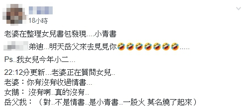 原PO在臉書社團「爆廢公社」發文表示,近日老婆幫女兒整理書包時,發現裡面藏有一張「小青書」,當下夫妻倆打開紙條一看,只見對方用生澀的國字及注音寫著,「XXX(女兒名)我要和你親親。XXX(男同學)」,原PO看完後血壓瞬間升高,連內心都燒起一股無名火。