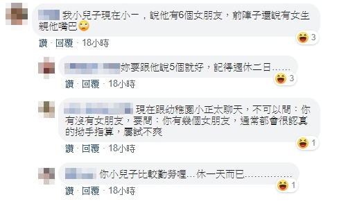 另外,不少家長也分享發現情書的經驗,「我女兒也是有這樣的情書,媽媽我直接殺到學校找人」、「我的餐服老師說,她的小女兒也有收到情書,內容是『我要照顧妳一輩子』,結果師丈跟她面對面講了1個小時」;還有媽媽無奈笑說,「我小兒子現在小一,說他有6個女朋友,前陣子還說有女生親他嘴巴」。