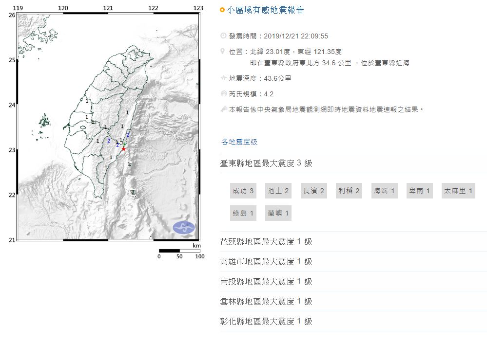 根據中央氣象局最新資訊,21日22時9分發生芮氏規模4.2地震,地震深度43.6公里,震央位於台東縣政府東北方34.6公里(位於台東縣近海),最大震度台東縣3級。