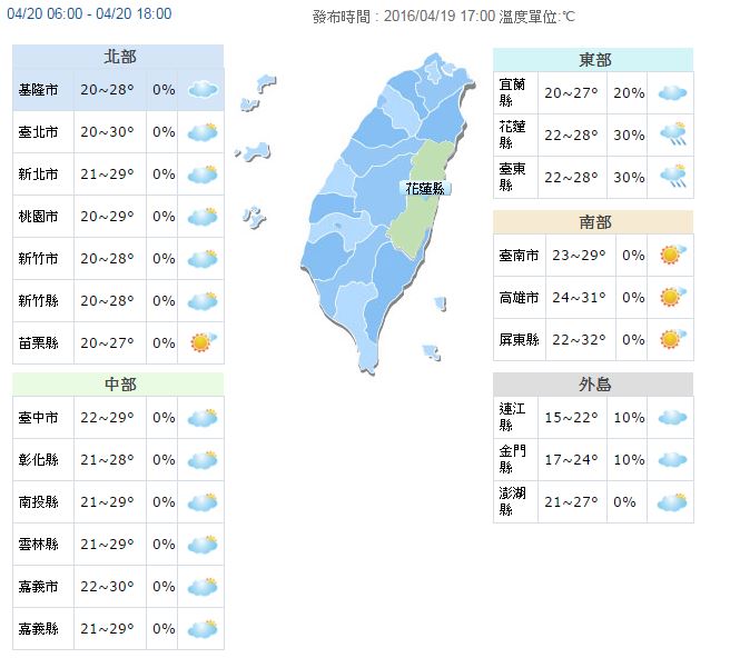 明(20)日臺灣各地及澎湖、金門、馬祖大多為多雲到晴的