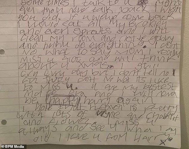 「我真的覺得妳是世界上最好的媽媽,我真的很想妳,好希望妳就在這,能讓我再次感到安心」,哈利在信中和媽媽分享自己在足球比賽的表現,還有多懷念她做的晚餐,「有時明知道妳不會回話,我晚上還是會跟妳說話,真希望妳會回我話。如果妳回來,我會把花椰菜和豆芽都吃光光、會打掃房間,不會頂嘴,會幫妳做所有的事。我每天都還是會哭,但我沒告訴任何人」。