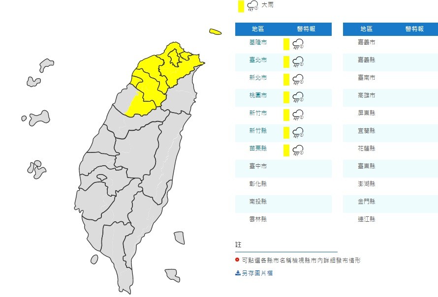 今天受南方雲系北移影響,全台天氣不穩定,台中以北及澎湖有局部大雨的機率,南部降雨時間較短,偶爾可見到陽光。氣象局今(30日)下午持續發布大雨特報,新竹以北地區及苗栗山區有局部大雨發生的機率,大雨特報7地區如下:基隆市、台北市、新北市、桃園市、新竹市、新竹縣、苗栗縣,民眾要特別注意。