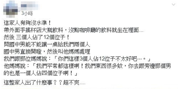後來國中男告訴媽媽,就換媽媽來和男網友溝通,男網友對媽媽說:「你們這樣3個人佔12位子不太好吧…」,沒想到媽媽竟然理直氣壯地回:「我們平常都這樣啊!」媽媽接著說:「我們東西很多欸,你去跟旁邊那個男的也是一個人佔四個位子啊!」最後男網友講不過他們,只好自認倒楣,不過想起這段過程,他還是忍不住說:「這整家人出了什麼事??超不爽…」。