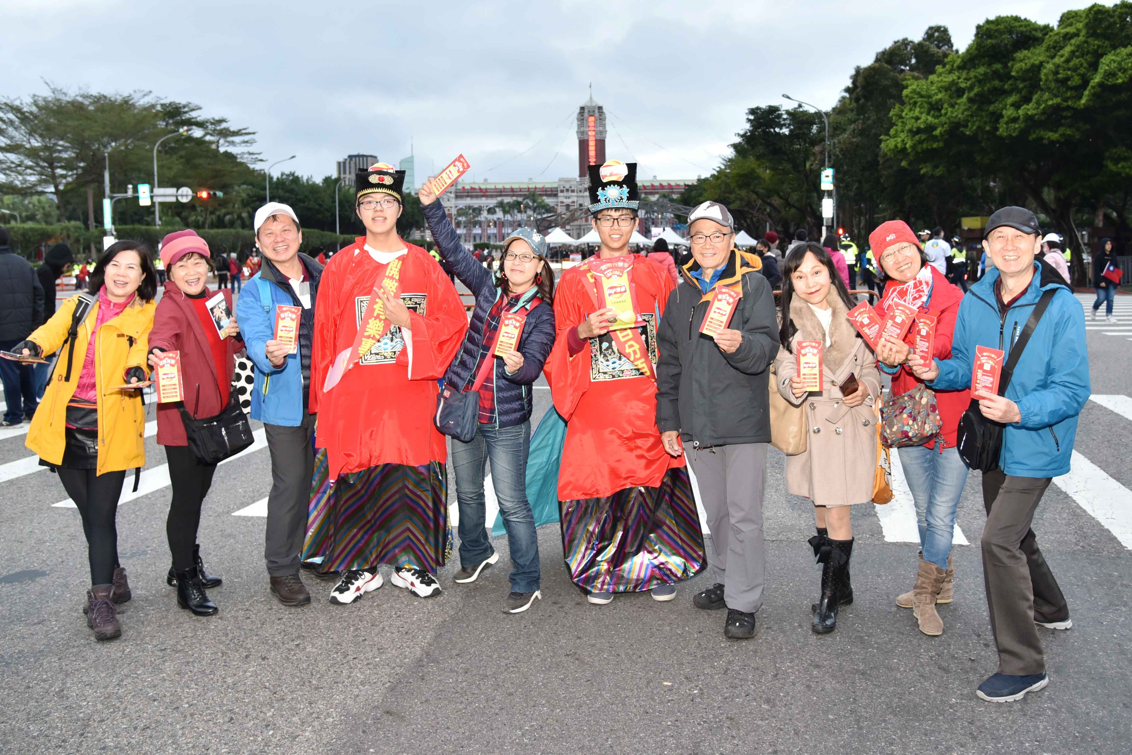上千民眾元旦清晨齊聚總統府前參加升旗典禮,典禮甫一結束,意外出現一百位財神爺,大跳 rap 版跳家官,還現場發紅包,陣仗之大前所未見,令圍觀民眾驚喜連連!驚呼「新年第一天遇到財神,一定會好運一整年!還是一次遇到一百位!」