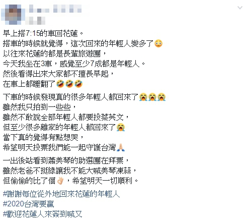 女網友在臉書社團《公民割草行動》發文,透露自己早上搭7點15分的車回花蓮,在搭車時發現,以往到花蓮的都是長輩旅遊團,但這次返鄉的年輕人變多了,「感覺至少7成都是年輕人,然後看得出來大家都不擅長早起,在車上都睡翻了」,原PO也表示,下車時發現真的很多年輕人都回來了,「雖然不敢說全部年輕人都要投蔡英文,但至少很多離家的年輕人都回來了,當下真的覺得有點想哭,希望明天投票我們能一起守護台灣」。