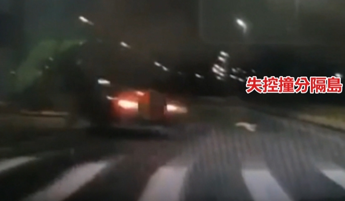 轎車在黑夜中快速奔馳,但卻在下一個彎道失控偏離車道,駕駛一度想往回拉,但車子先往左偏後,再往右滑,最後整台車開上分隔島,噴出陣陣火花,180度翻滾消失在鏡頭中。