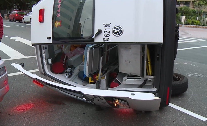 另一起車禍意外發生在12日早上七點多,上班時間車水馬龍,一輛救護車就這麼側翻在馬路上,器材、病床,翻的翻,倒的倒,旁邊一輛小客車車頭受損嚴重,救護車要救人,卻反而先出了車禍。