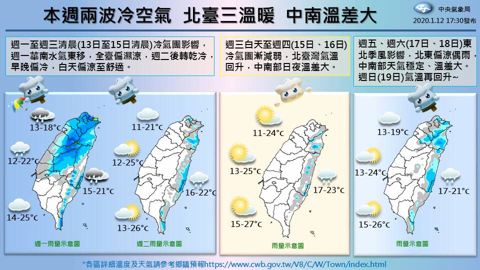 氣象局也預測,從明日到周三(13日到15日)清晨,天氣持續受到大陸冷氣團影響,中部以北及東北部天氣偏冷,如北部地區14日、15日低溫可探至11度,其他地區早晚亦冷須留意日夜溫差;須待15日白天至16日大陸冷氣團逐漸減弱,氣溫才會稍稍回升,恢復多雲到晴的天氣。