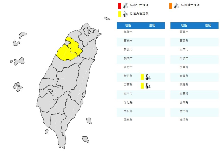 根據縣市測站數據,今晚(12日)6時50分在新竹測站已出現13.6度,苗栗測站在晚上7時則是13.7度。氣象局指出,今、明(12日、13日)受大陸冷氣團影響,中部以北及東北部的氣溫偏低,今中午已發布今年首波低溫特報,新竹縣、苗栗縣在今晚至明日上午局部地區有機會下探10度以下低溫,提醒民眾注意。