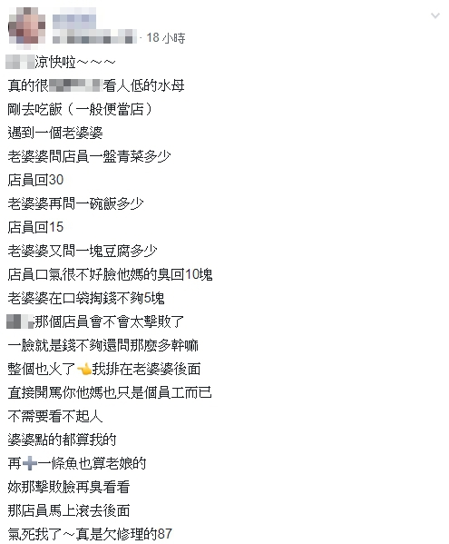 該名女網友在臉書社團「爆怨公社」透露,近日到便當店用餐時,遇到一位老婆婆也來買飯菜,當時對方先問一盤青菜及一碗飯的價錢,而店員也一一回答,但老婆婆似乎身上錢不夠,想買便宜一點的東西,因此又問了一塊豆腐的價格,此時店員開始顯得不耐煩,不僅擺出臭臉,還口氣很差地回覆「10元」。