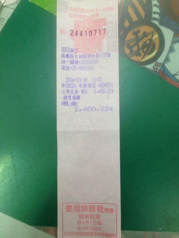 發票時真的要睜大眼睛了!嘉義大林有間五金百貨的工讀生,將224元的發票,